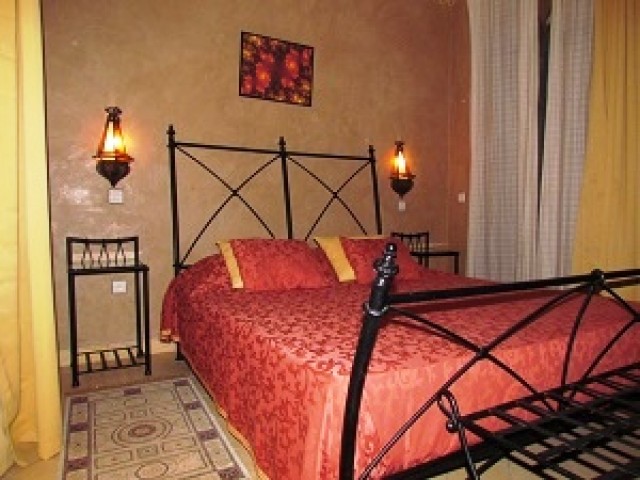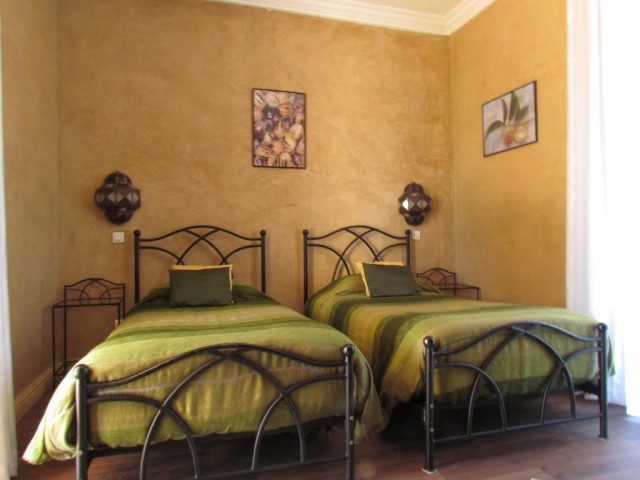 Beautiful twin room including a sleeping area with double beds, two bedside tables, a desk and its seat, and a closet. The bathroom is in taddelack and bejmat. This room has a terrace under the arcades and a private garden overlooking the olive trees. It is a very quiet room, just rocked by the song of the birds and the lapping of the fountains. It is accessible to people with difficulty moving: the sink is low enough to sit and the shower includes a seat.